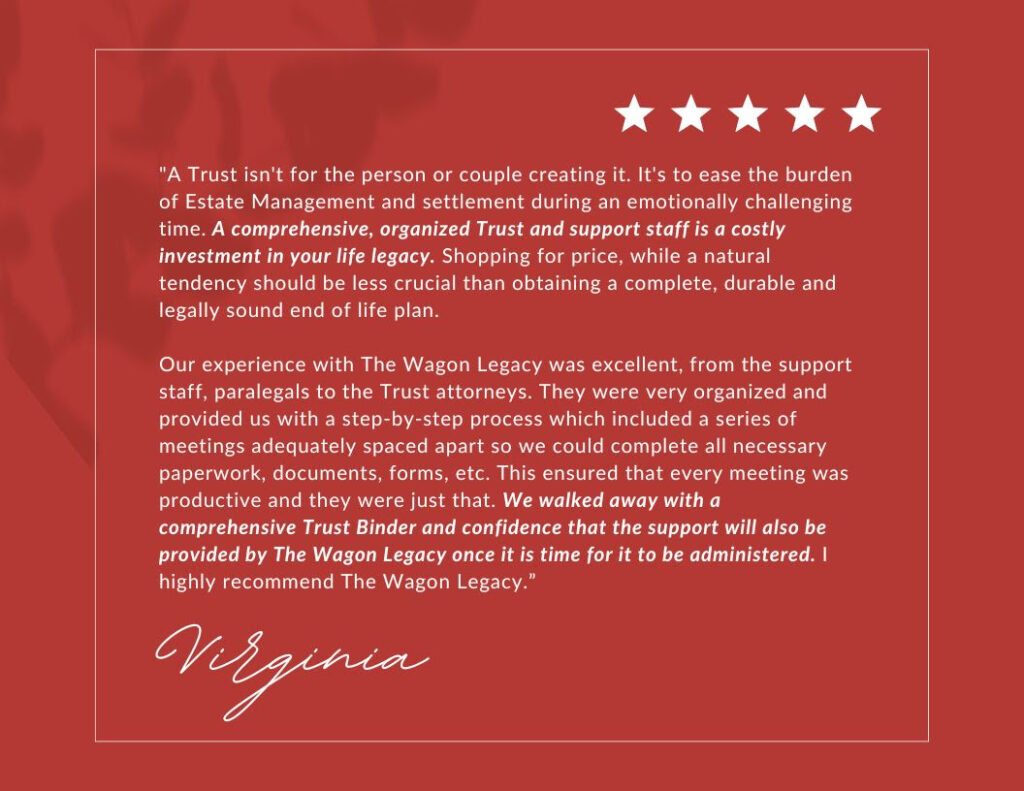 This is such a contrast with our clients feel – our clients find peace of mind knowing their families are protected, and their wishes will be honored. That’s the difference with The Wagon Legacy—we don’t just create trusts; we build lasting relationships and provide genuine security for the future.