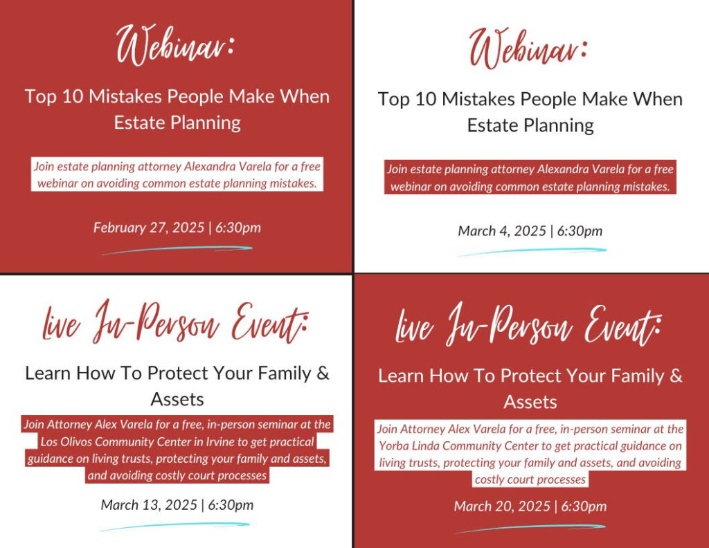 Join me for a free, live seminar or webinar where I’ll walk you through everything you need to know about trusts, estate planning, and ensuring your loved ones are taken care of—without the hassle of court processes.